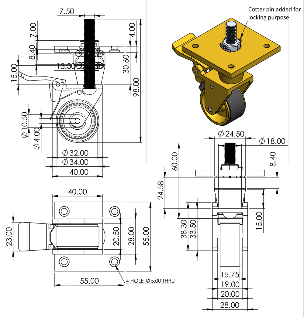Pour cette roulette en laiton extra large à usage intensif, le diamètre de la roue est de 75 mm